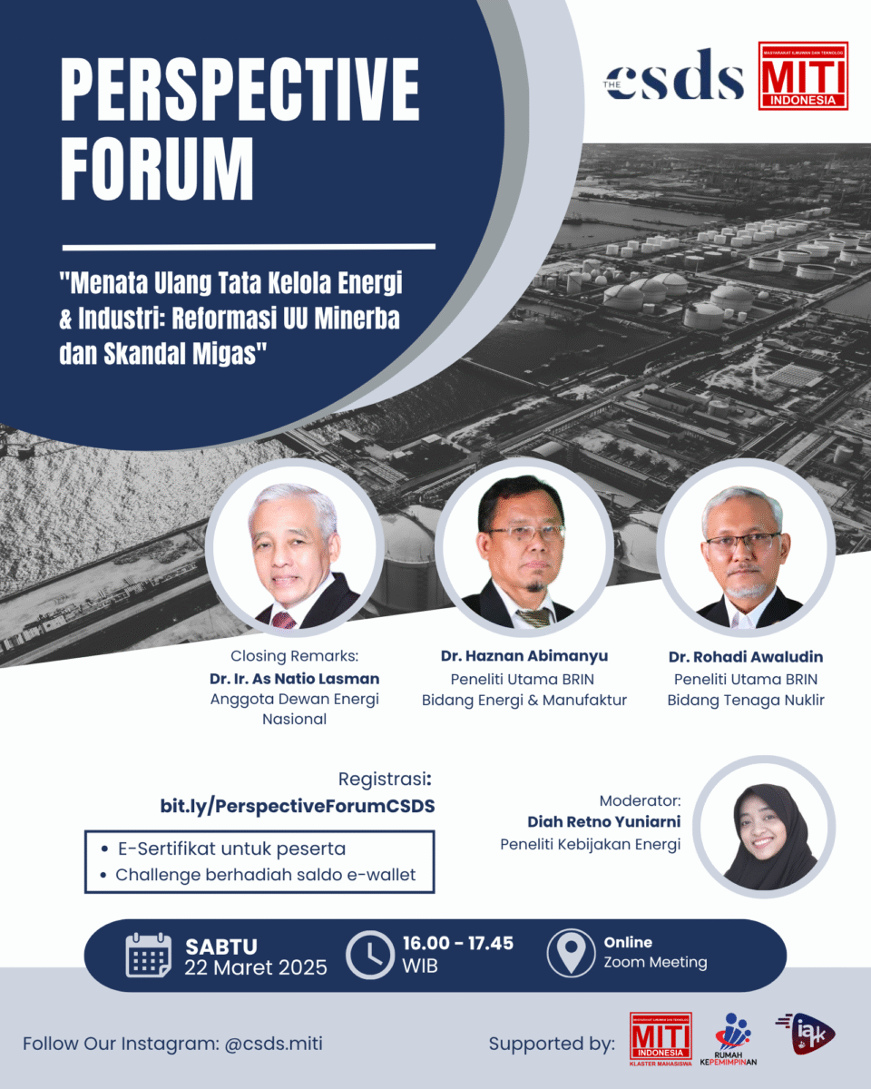 Namun, berbagai tantangan teknis dan regulasi masih membayangi implementasi di lapangan. Oleh karena itu, CSDS MITI mengundang publik untuk memastikan bahwa integrasi investasi ini benar-benar mempercepat masa depan energi bersih Indonesia.